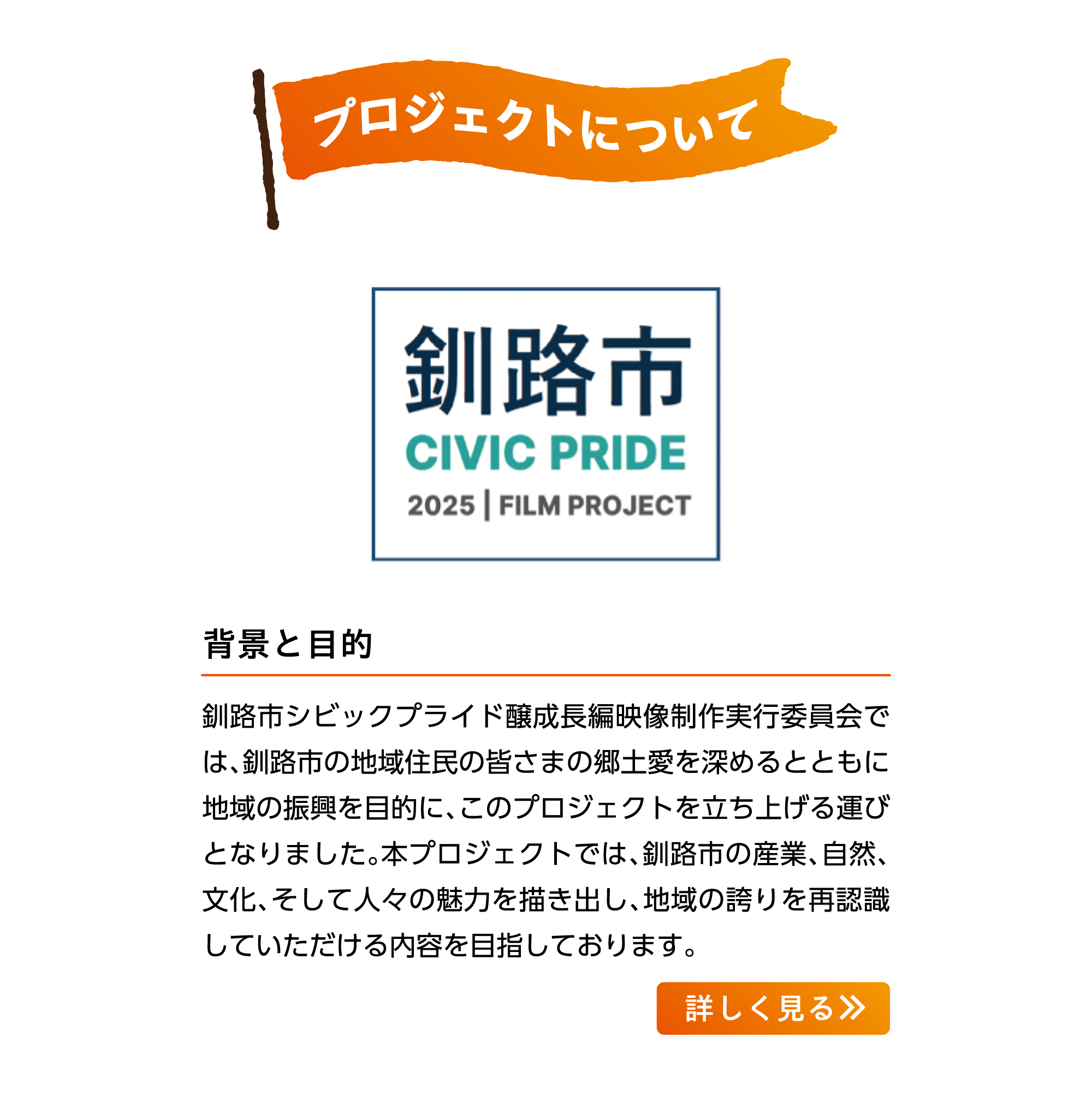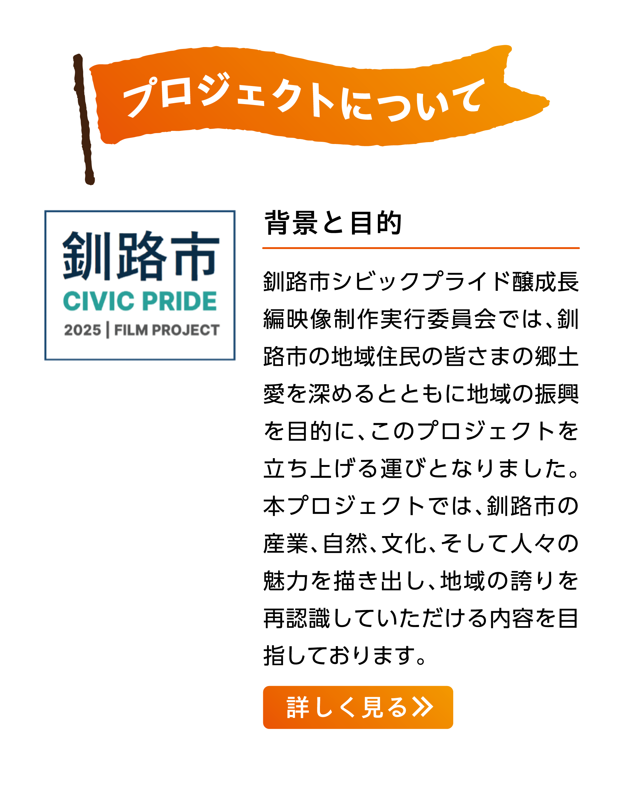 釧路市シビックプライド醸成長編映像制作実行委員会では、釧路市の地域住民の皆さまの郷土愛を深めるとともに地域の振興を目的に、このプロジェクトを立ち上げる運びとなりました。本プロジェクトでは、釧路市の産業、自然、文化、そして人々の魅力を描き出し、地域の誇りを再認識していただける内容を目指しております。