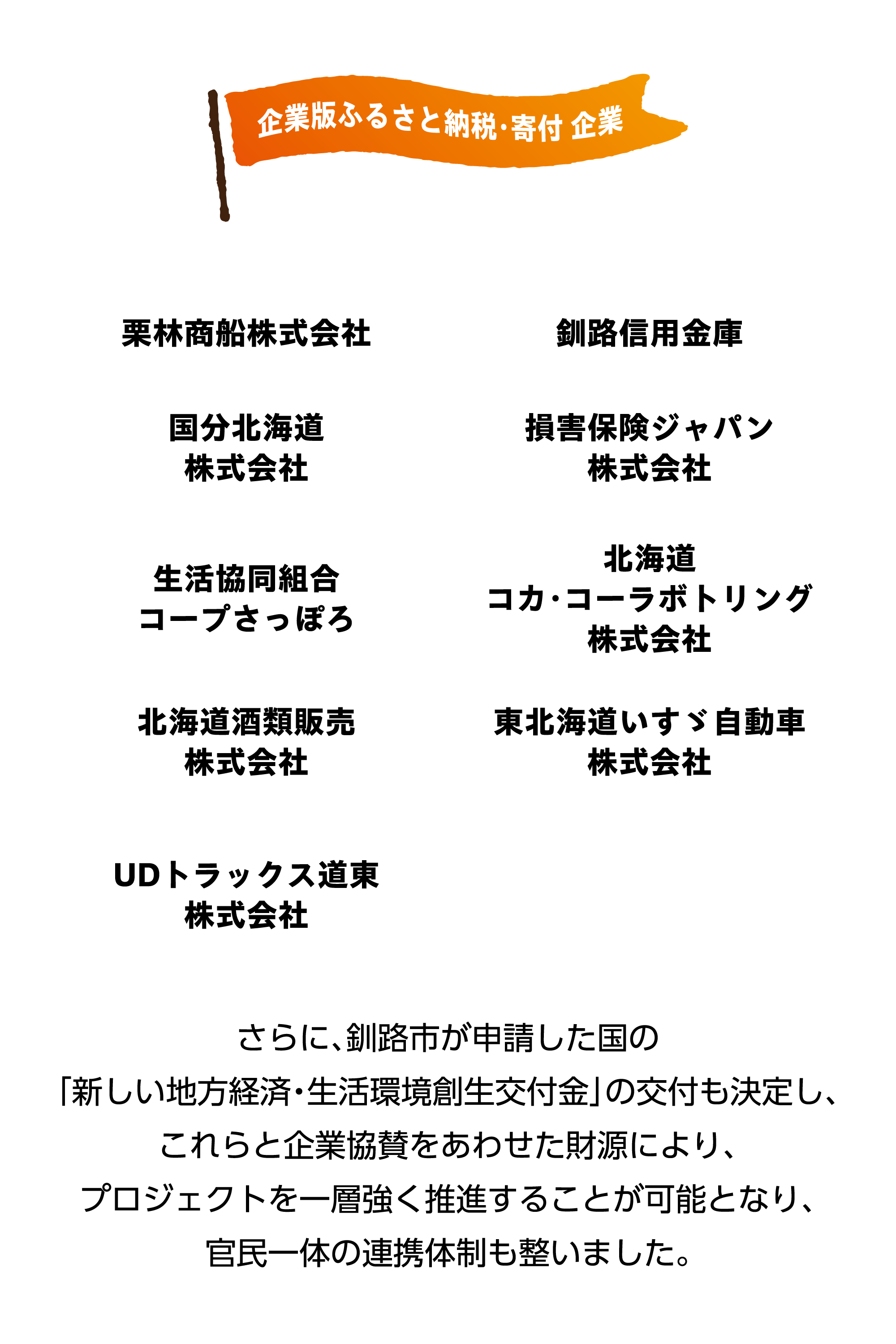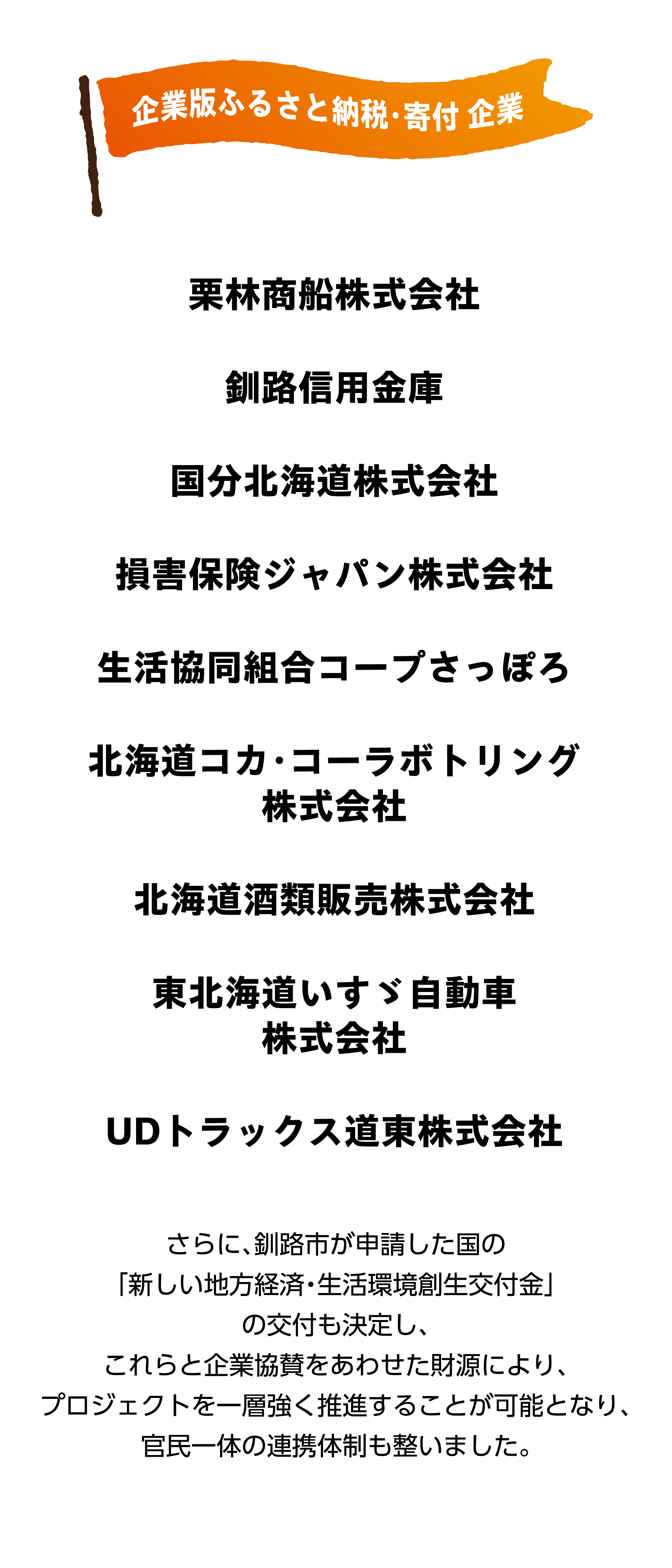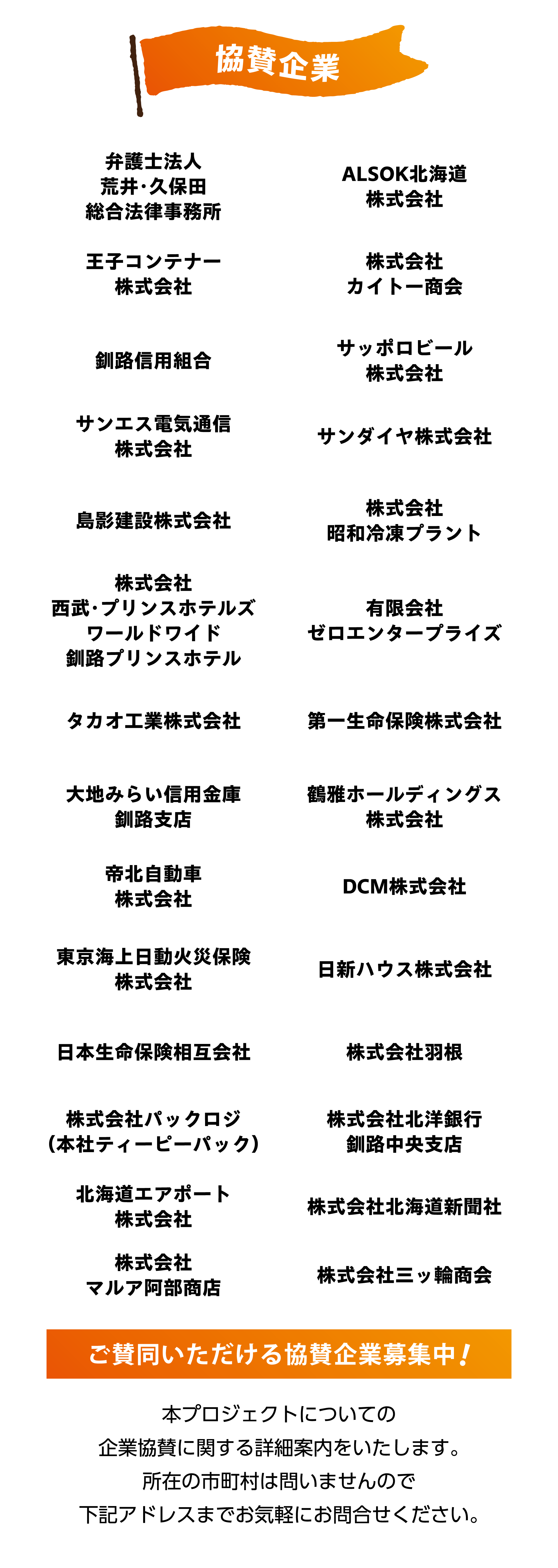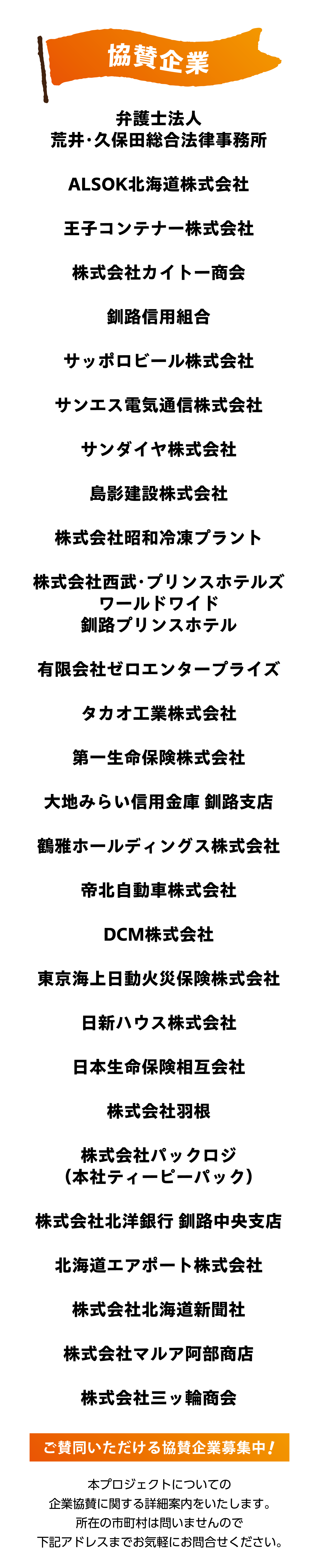 弁護士法人荒井久保田総合法律事務所 ALSOK北海道株式会社 王子コンテナ―株式会社 株式会社カイト―商会 釧路信用組合 サッポロビール株式会社 サンエス電気通信株式会社 サンダイヤ株式会社 島影建設株式会社 株式会社昭和冷凍プラント 株式会社西武・プリンスホテルワールドワイド 釧路プリンスホテル タカオ工業株式会社 第一生命株式会社 大地みらい信用金庫 釧路支店 鶴雅ホールディングス株式会社 帝北自動車株式会社 DCM株式会社 東京海上日動火災保険株式会社 日新ハウス株式会社 日本生命株式会社 株式会社羽根 株式会社パックロジ(本社ティービーパック) 株式会社北洋銀行 釧路中央支店 北海道エアポート株式会社 株式会社北海道新聞 株式会社マルア阿部商店 株式会社三ッ輪商会