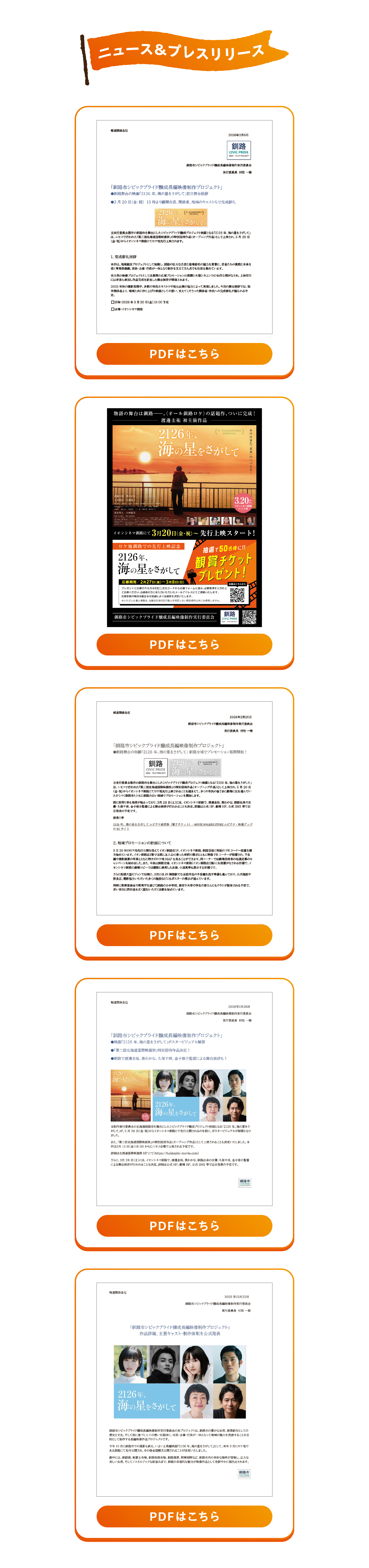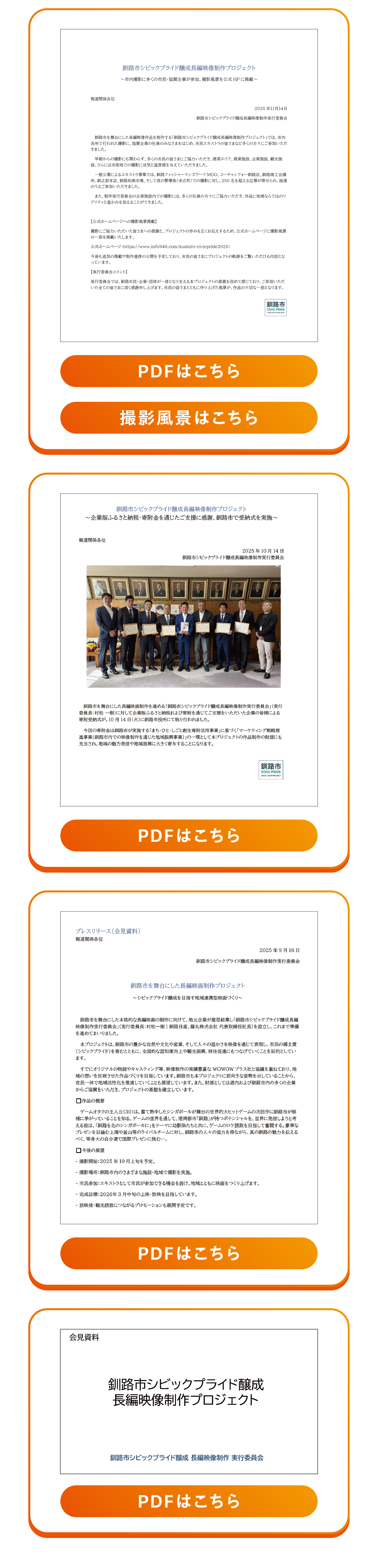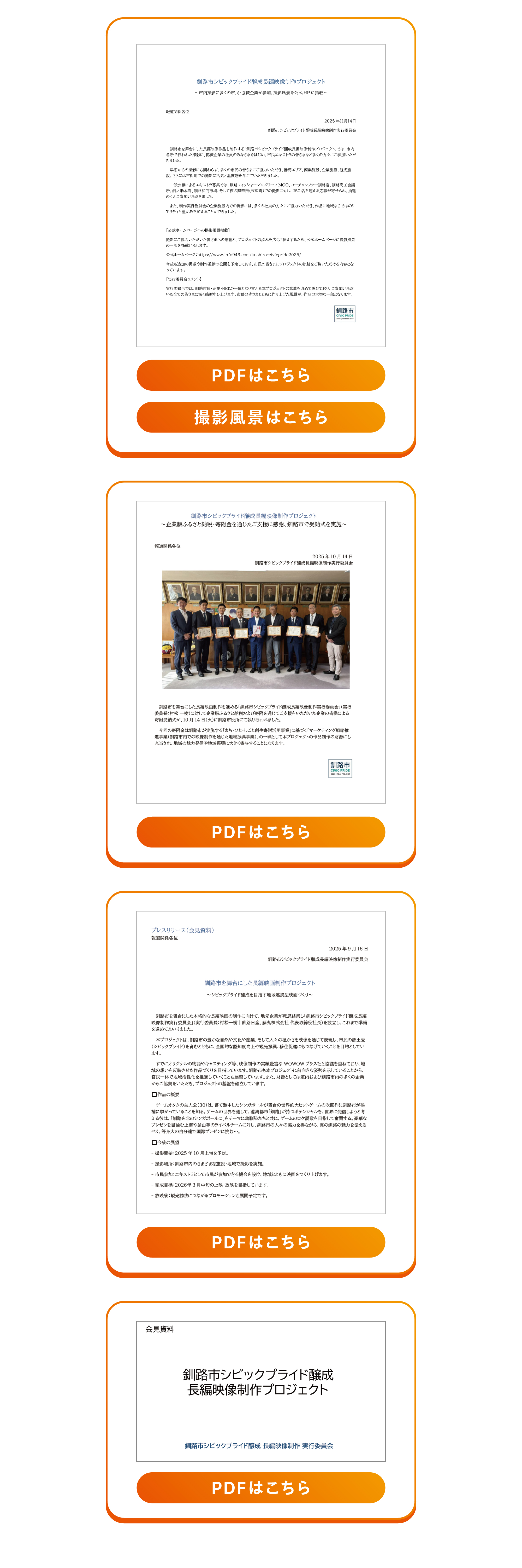 釧路市CIVIC PRIDE 2025 | FILM PROJECT プロジェクトについて ニュース&プレスリリース 映画概要 撮影地市民参加 実行委員会 協賛企業 お問い合わせ ニュース&プレスリリース PDFはこちら PDFはこちら