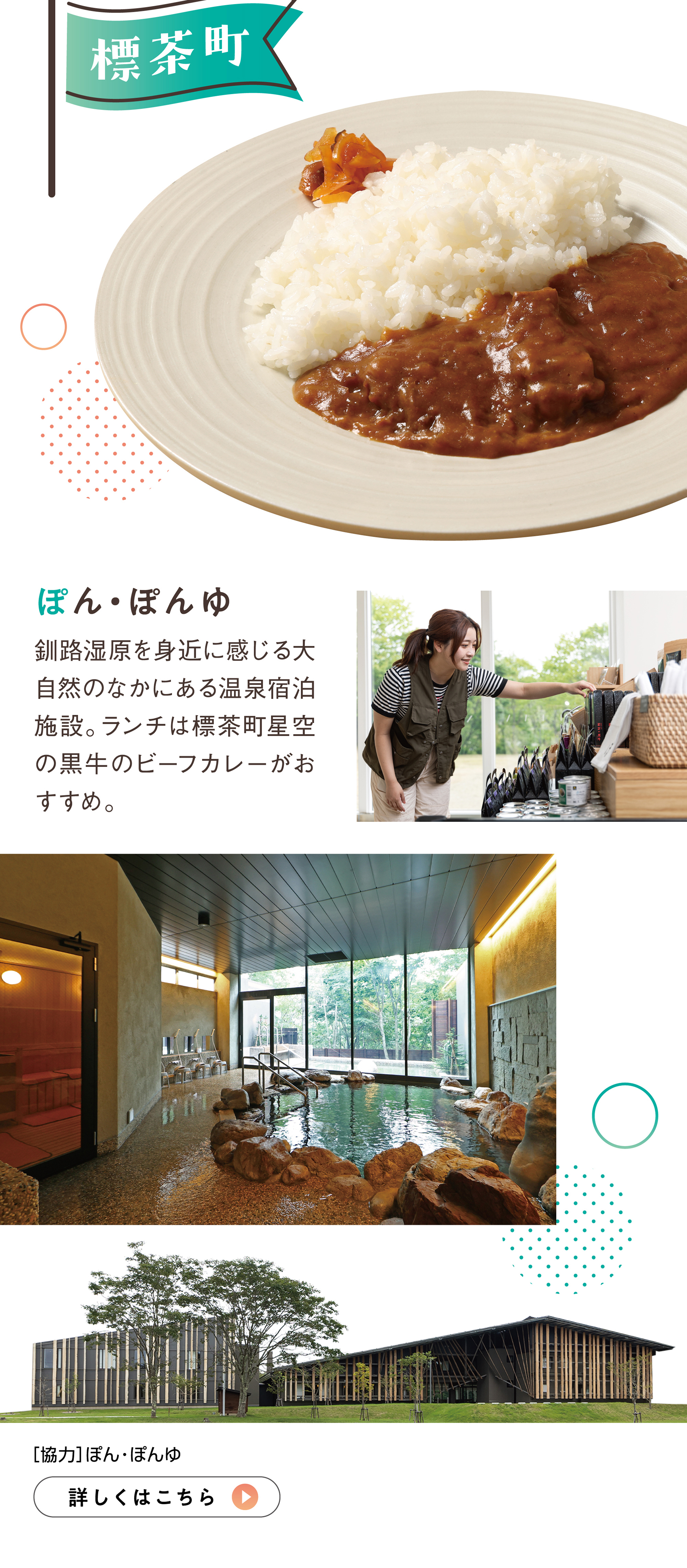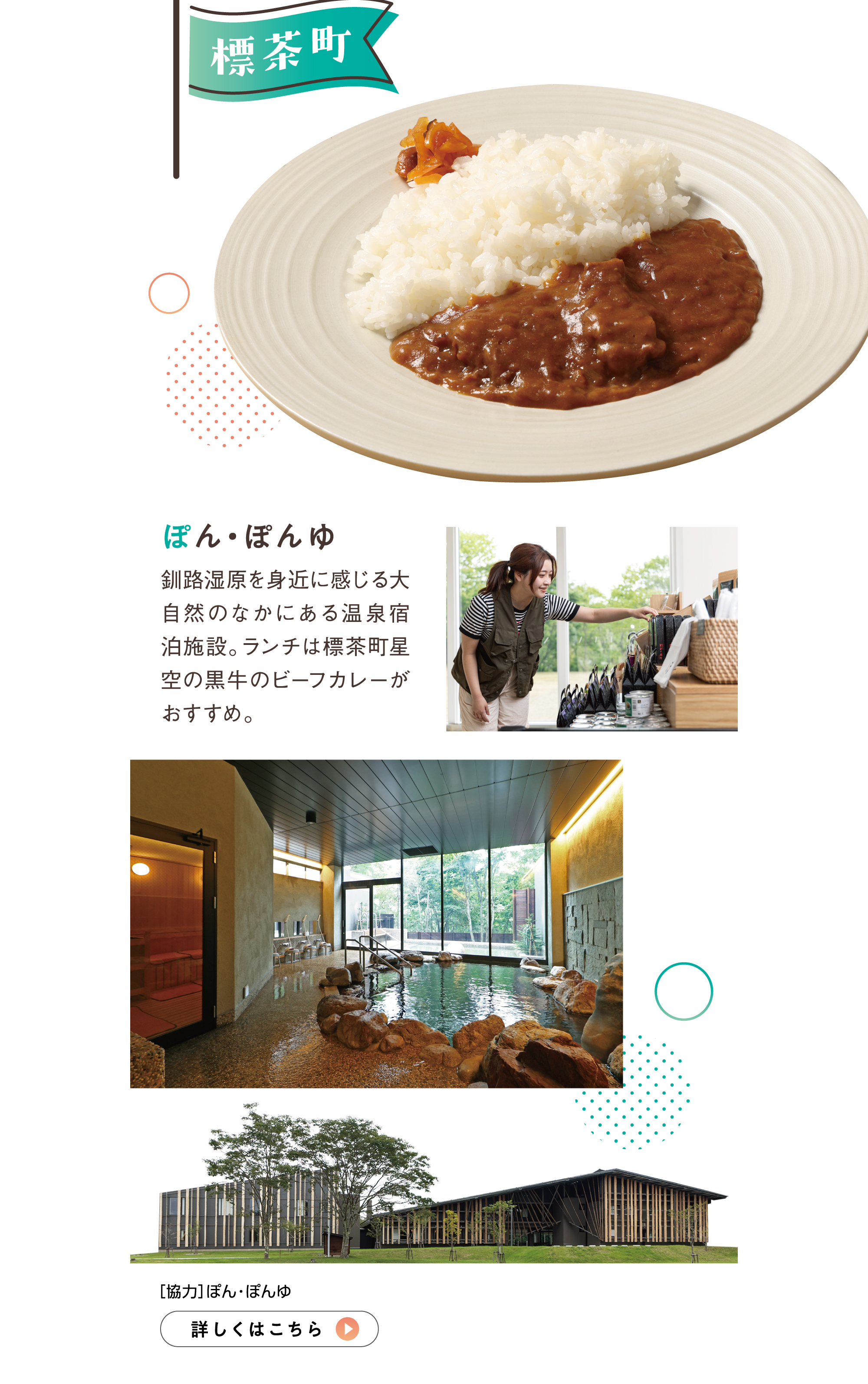 釧路湿原を身近に感じる大自然のなかにある温泉宿泊施設。ランチは標茶町星空の黒牛のビーフカレーがおすすめ。