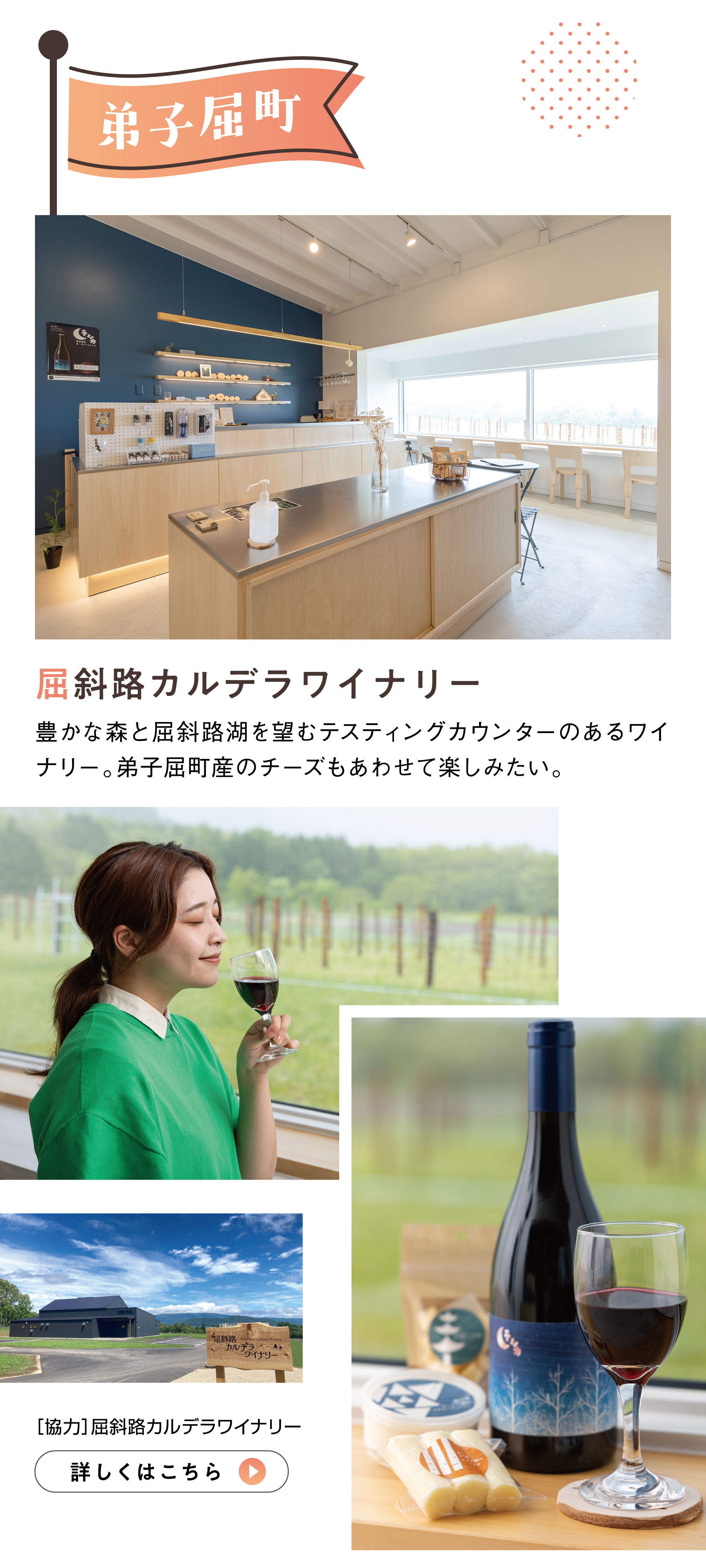 豊かな森と屈斜路湖を望むテスティングカウンターのあるワイナリー。弟子屈町産のチーズもあわせて楽しみたい。